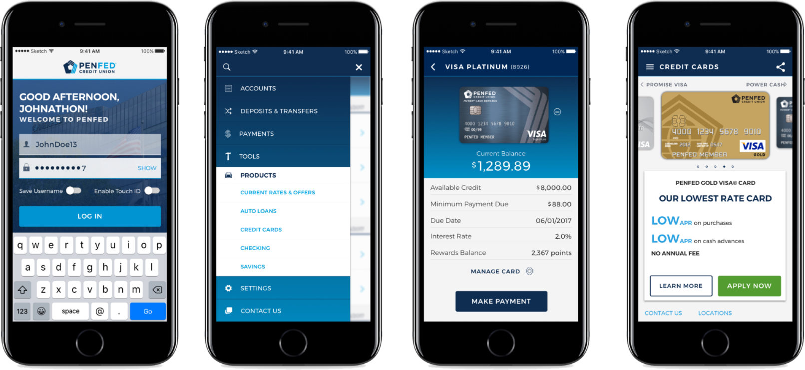 We collaborated with key executive stakeholders and the PenFed development team to design a completely new mobile app used by members of the third largest credit union in the country. Mobile best practices were used to create a hybrid app for Android and iOS devices using the Ionic Framework. A modified theme was designed while still using as much default functionality within Ionic as possible. Increased capabilities include Fingerprint Identification, Mobile Bill Pay, Improved navigation and mobile form entry.